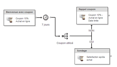 Le marketing automatisé est souvent composé d’une suite de communications afin d’emmener votre client ou prospect à faire une action. Par exemple, un visiteur de votre site web s’abonne à votre infolettre. Après son inscription, un message automatique de bienvenue lui est envoyé. Ce message de bienvenue contient un rabais sur un premier achat. Un rappel est envoyé une semaine plus tard si le rabais n’a pas été utilisé.