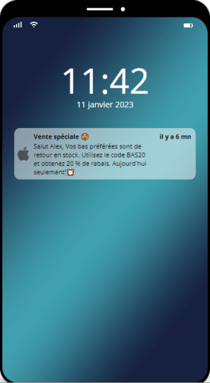- Utilisation des données client, telles que l’historique des achats, les données démographiques, etc., pour cibler les clients en fonction de leurs besoins spécifiques. Si vous possédez une boutique en ligne qui vend des articles de papeterie, vous pouvez envoyer une notification push pour informer les clients que de nouveaux stylos viennent d’être ajoutés à l’inventaire. Ce message serait mieux reçu si vous informiez les clients qu’ils ont déjà acheté plusieurs stylos auprès de votre entreprise.