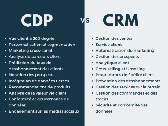 Contrairement à une CDP, qui se concentre sur la collecte et l’organisation des données clients, un CRM est davantage axé sur la gestion du processus de vente et l’amélioration du service client.