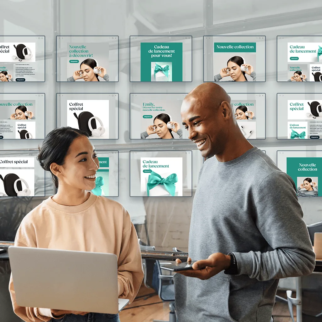 Propulsé par l’IA, par votre librairie de contenus et par votre catalogue de produits, gagnez en efficacité. Générez 5 ou 500 déclinaisons unilingues ou multilingues de votre campagne pour augmenter l’engagement.